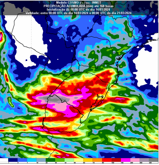As condições de tempo severo persistem até a próxima quarta (20), com acumulados significativos de chuva, que podem superar os 200 milímetros (mm) em áreas do centro e oeste do Rio Grande do Sul e acima dos 100 milímetros (mm) nas demais áreas do estado, e entre Santa Catarina e o Paraná.