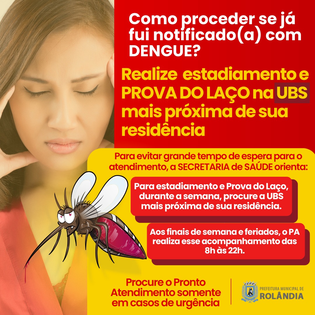 A secretaria de Saúde informa que dengue é um diagnóstico que precisa ser acompanhado. Ao sentir alguns dos sintomas, como febre, manchas vermelhas no corpo, dor de cabeça, vômito, dores nas articulações, falta de apetite, diarréia , dentre outros, procure a Unidade Básica de Saúde (UBS) mais perto de você, para iniciar o acompanhamento e depois até o sétimo dia de sintomas procure a UBS para a prova do laço.