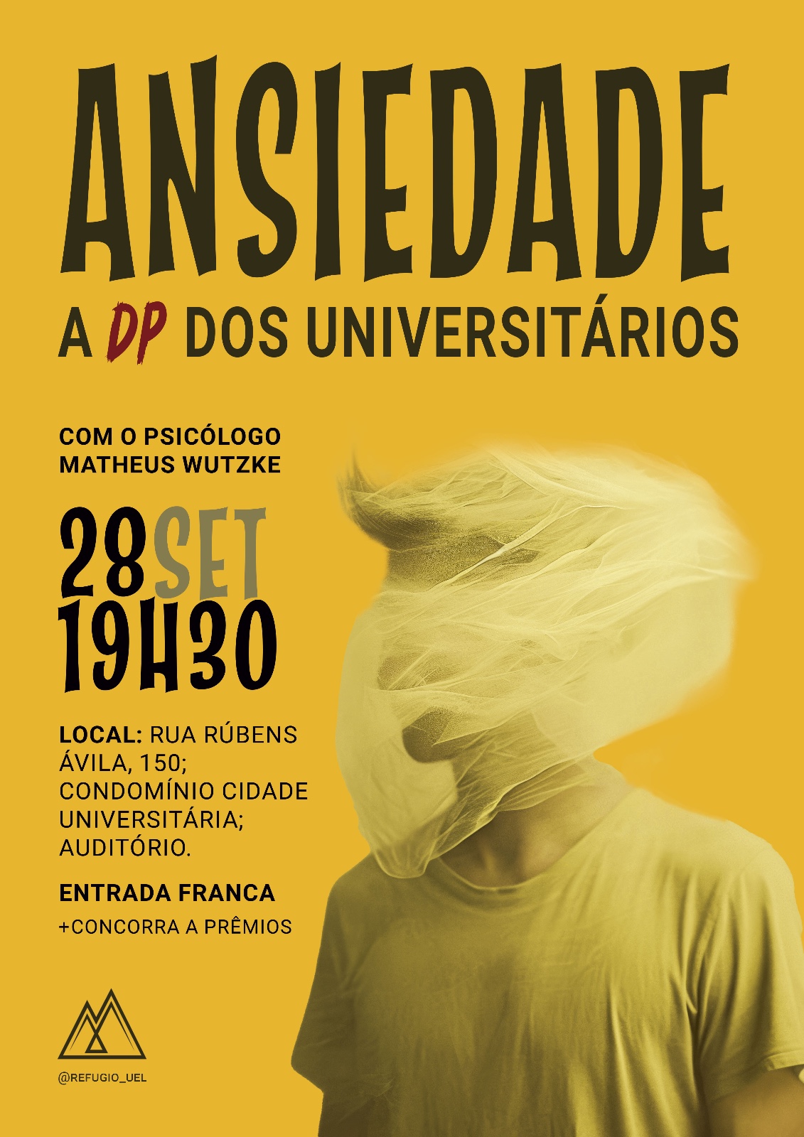 No próximo sábado (28) o Refúgio Universitário, ambiente gratuito para estudo, promove o evento ” Ansiedade: A DP dos universitários”. A programação inclui uma conversa com o psicólogo Matheus Wutze, jogos de saúde mental, perspectiva e sorteio de brindes. A entrada é gratuita e a ação será realizado no auditório do Condomínio Cidade Universitária, na rua Rubéns ávila, 150. As atividades iniciam a partir das 19h30.